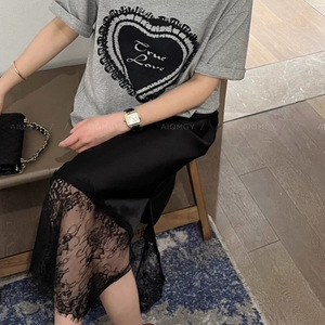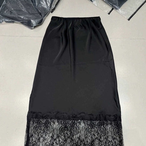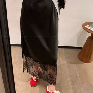 法式黑色蕾丝拼接半身裙女醋酸缎面裙子春夏高腰显瘦a字大摆长裙