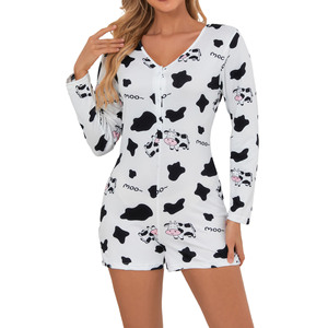 2025年新作 牛柄Vネック長袖レディースワンピースパジャマ ゆったりシルエット ホームウェア シンプルカジュアル
