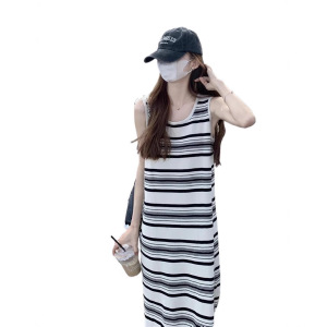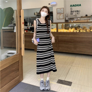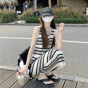 ストライプストレートニットストラップワンピース女性春夏カジュアルゆるいベストtシャツ海辺休暇ロングスカートと足首
