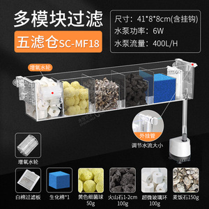 フィルタービン5箱 長さ41cm(内側または外側に吊り下げ可能) + 水流調整可能な6Wウォーターポンプ