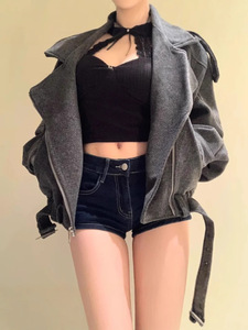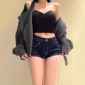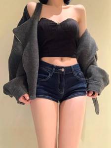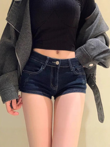 アメリカンスタイルのローウエスト超短パン、タイトフィットでセクシーな伸縮性のあるヒップハグショーツ、夏に外で履くためのダークブルーのデニムショートパンツ、着痩せ効果あり