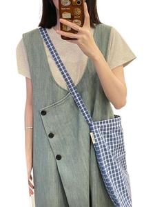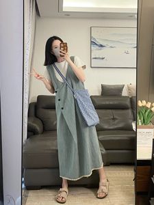 レトロなダメージ加工デニムサスペンダースカート女性の夏のデザインボタンローエッジスリムノースリーブドレスベストロングスカート
