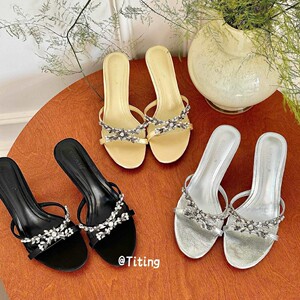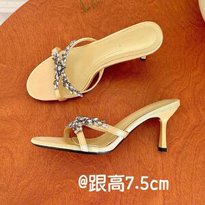 クールな貴婦人!気質ラウンドトゥラインストーンチェーンワンラインストラップスティレットサンダル女性の夏のハイヒールサンダル