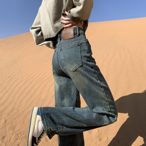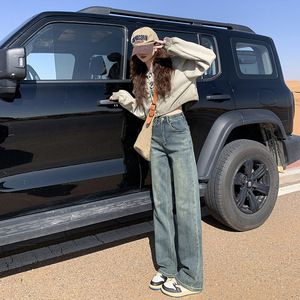 セメントグレーのジーンズ レディース 春秋新作 ストレート ルーズ 細見え ハイウエスト ナローワイドパンツ ロング丈