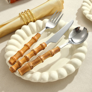 クロスボーダー竹祭り食器セット天然竹ハンドルナイフフォークスプーン304ステンレスホテル洋食ギフトセット