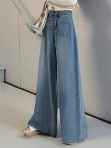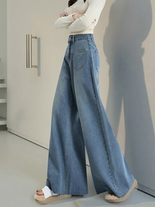 女性用ハイウエストブルーワイドレッグパンツ、ハイウエストルーズデニムパンツ、人気のストレートレッグ、大きな裾のデザインでスリムに見えます。