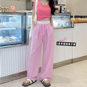 ピンクの格子柄ワイドパンツ レディース 夏 薄手 ゆったり カジュアル ストレート ドレープ ロングパンツ ハイウエスト 着痩せ効果