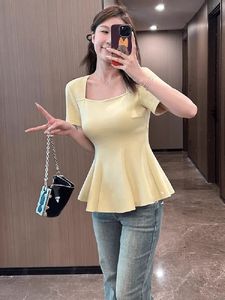 プラスサイズファットmm右肩スクエアカラー半袖Tシャツ女性用、肉感カバー、ウエストカーブデザイン、半袖ウエスト痩身トップ