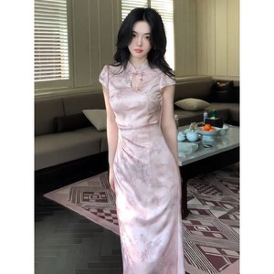新しい中国風のピンクのチャイナドレス女性のための夏の2025新しい気質ウエスト痩身美しいロングスカート