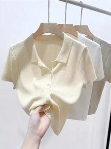 夏の女性向けの薄いポロカラーセーター、スリムな半袖、小柄な人向けの無地の万能ショートカーディガントップ