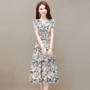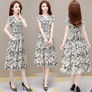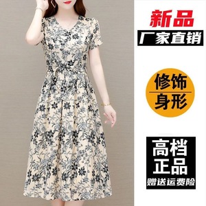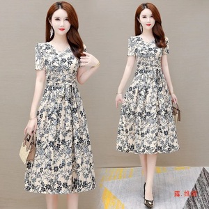 冰丝碎花领系带短袖中长连衣裙女装夏季新款显瘦洞洞棉休闲裙子