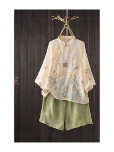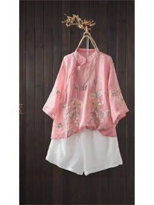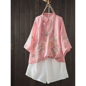 中国風の刺繍ラミーシャツ女性の夏の斜め襟ボタンアップスタンドカラータングスーツシャツ気質コットンとリネンプルオーバートップ