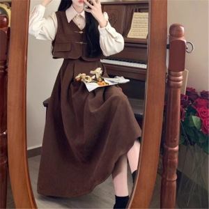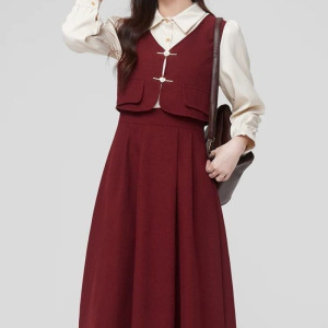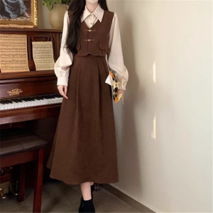 学院风假两件拼接灯芯绒连衣裙女秋冬大码法式复古气质显瘦长裙子