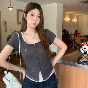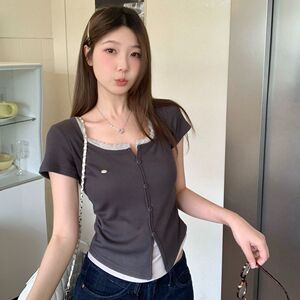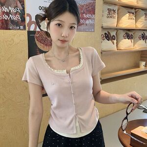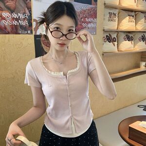 レース偽ツーピースショルダー半袖Tシャツ女性の夏の新しいデザインニッチスリムショート純粋な欲望トップ