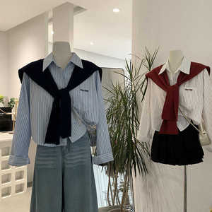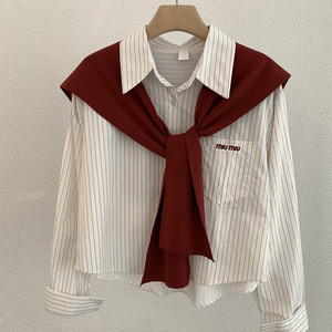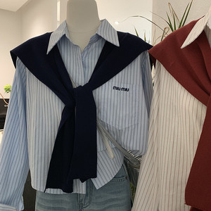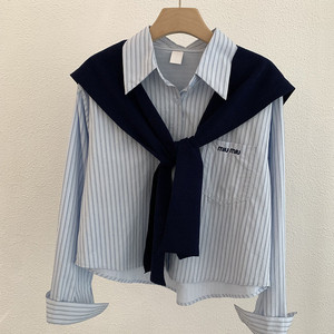 H8A2025春装新款学院风刺绣条纹长袖衬衫+针织披肩森