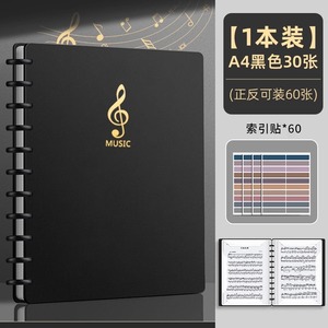 シンプルな黒のシート30枚/60ページ収納可能(インデックスシール+蛍光ペン+楽譜集+楽譜クリップ付き)。
