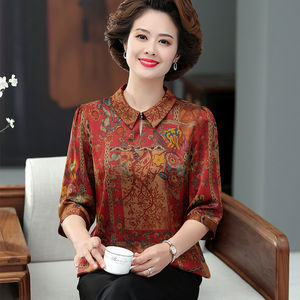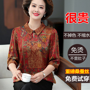 ママのマルベリーシルクスタイルトップス、高級ミッドスリーブシャツ、中高年女性のゆったりスーツ、シルクTシャツT