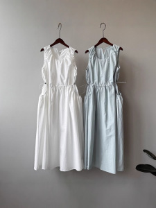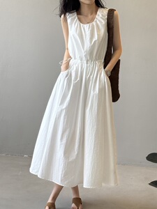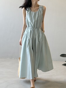 韓国スタイルの巾着ウエストベストドレス女性の夏のラウンドネックスリムノースリーブロングスカートスリム