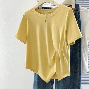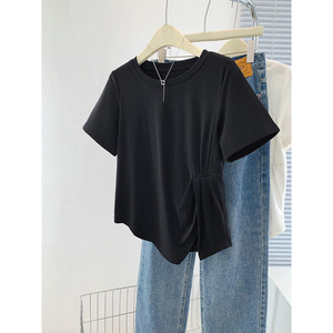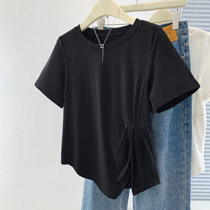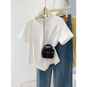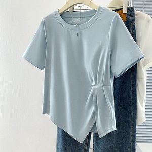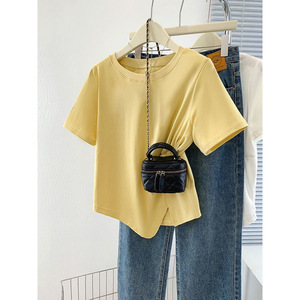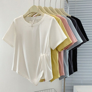 【店頭売れ筋】太ったmm向けのスリットデザイン夏用純綿半袖Tシャツ、大きいサイズでお腹をカバーしてスリムに見える半袖