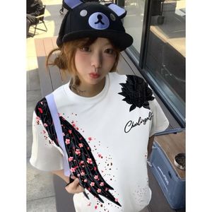黎組主アメリカ復古高街立体レリーフ刺繍羽羽純綿丸襟潮牌半袖tシャツ女