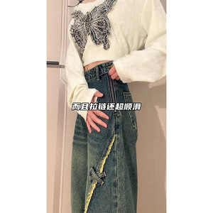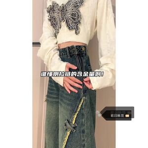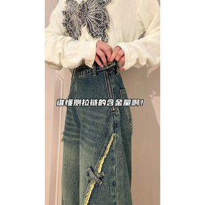 大码美式复古侧边拉链毛边直筒牛仔裤女夏季蝴蝶贴宽松阔腿长裤潮