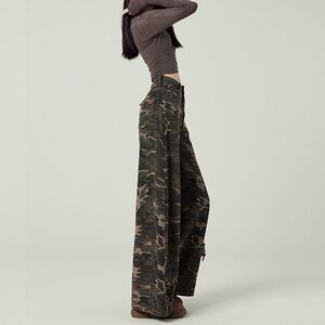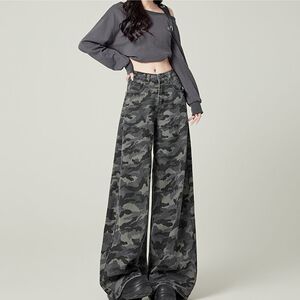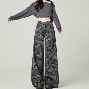 小柄なアメリカ式高街工装広脚迷彩ジーンズ女性レトロ高腰ゆるい痩せストレート長ズボン