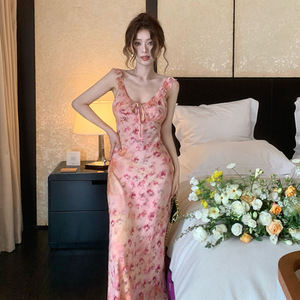 ティーブレイクフレンチ優しい気質Vネック花柄サスペンダードレス海辺リゾートスタイル体型ウエストカバーヒップスカート