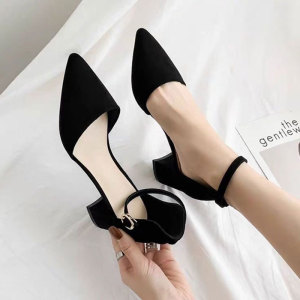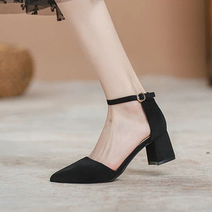 包頭サンダル女性のフェアリースタイル 2025 春の新プロフェッショナルポインテッドトゥハイヒールシングルストラップ太いヒールミッドヒール靴