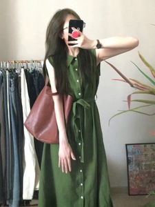 2025年春夏新作 ノースリーブシャツワンピース レディース ゆったり着痩せ効果 レースアップ エレガント ロングワンピース 高級感