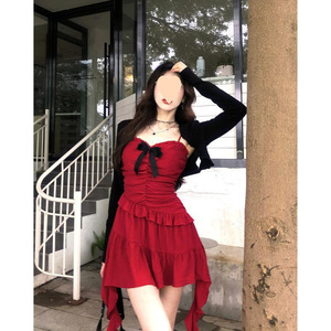 夏季穿搭一整套红色吊带设计感不规则连衣裙女夏季收腰蝴蝶结裙子