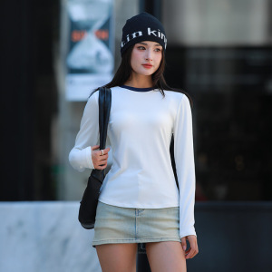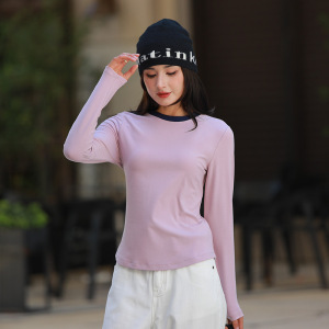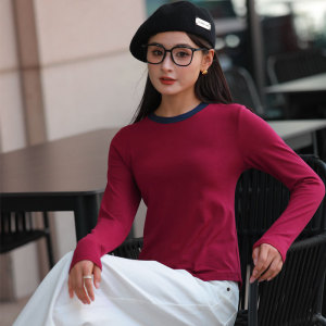 2024 秋の新コラーゲンレーヨンマルベリーシルク長袖ラウンドネック無地コントラストカラーネック Tシャツ 2533