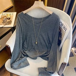 低领露锁骨抽绳恤女夏季温柔甜美收腰辣妹纯色短款薄上衣晒衫