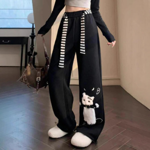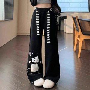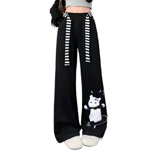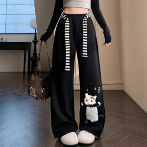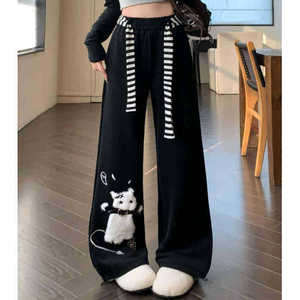 プラスサイズファットMMアメリカンかわいい猫黒カジュアルスウェットパンツ女性の春夏怠惰なスタイルのルーズワイドレッグパンツ