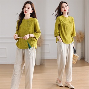 女性用夏用テンセル綿麻トップスとパンツセット、多用途でファッショナブルな2点セット、ピンク、グリーン、レンガレッド、その他