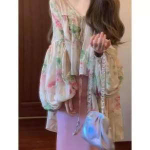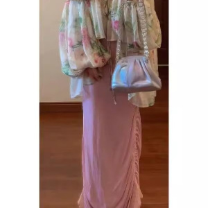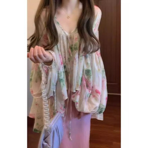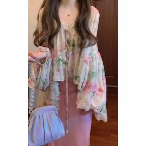 桃織りトワイライト春夏の新しい中国風プリント快適なカーディガン & ロマンチックなピンクのプリーツサスペンダースカートスーツ