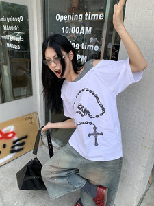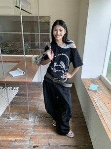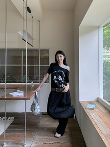 [9hour] 個性的な偽の肩のtシャツの女性2025夏のゆったりとした百合は色の上着の女性m 11328にぶつかります。