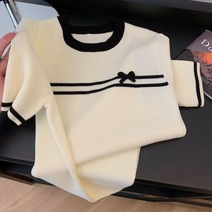 ゆったり痩身【40-100kg】ラウンドネックコントラストアイスシルクトップレディース夏リボン右肩半袖Tシャツ