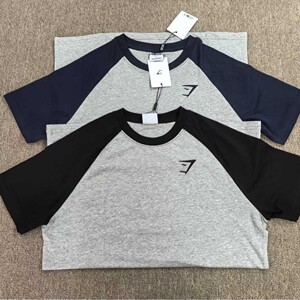 Gymshark raglon修身半袖tシャツ男性は体の弾力性を示しています。