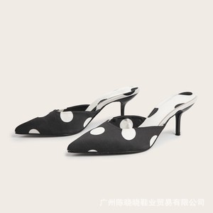 ポインテッドトゥの黒と白の水玉模様のスリッポン スティレット ハイヒール シューズ