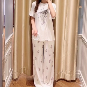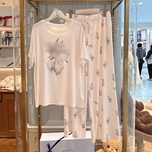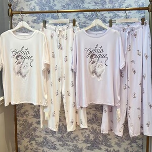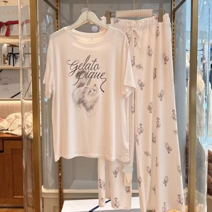 ふわふわアイスクリーム猫リボン漫画甘いプリント丸首半袖長ズボン女性パジャマ家服セット