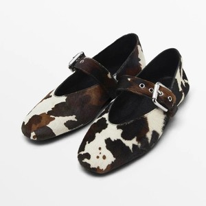 スペイン MD 婦人靴パーソナライズされたレトロなラウンドトゥ牛柄馬毛平底ソフトバレエシューズメリージェーンシューズ