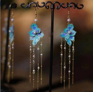 金メッキ模造ポイントシルク焼付ブルー象嵌真珠蓮タッセルイヤリング女性の新しい中国風のクラシックスタイルのイヤリング