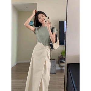 夏のドーパミンウェア、塩気女神風グリーンニットトップスとスカートのツーピーススーツの完全なセット