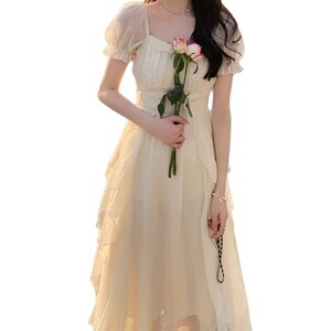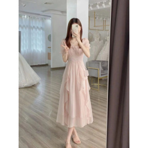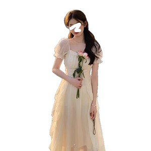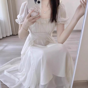 フレンチスクエアネック甘くて優しいフェアリースタイルドレスレディース夏の新しい女性のウエスト痩身ミドル丈スカート