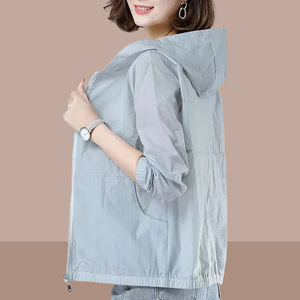 大きいサイズの日焼け止めの服の女性の夏の2025新型の屋外の通気性の薄いタイプの帽子の組み合わせの日焼け止めの服のカーディガンのショートコート