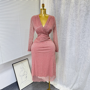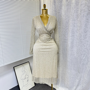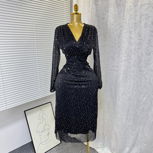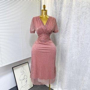 2025 夏の新フレンチエレガントな V ネックウエストホットダイヤモンド光沢のある半袖ドレス女性のファッション宴会ドレス