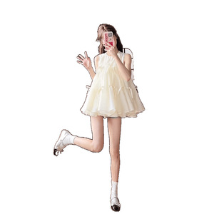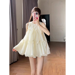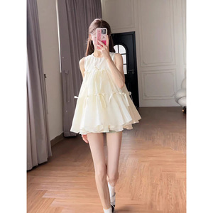 甘いスタイルのノースリーブベビードールシャツ、妖精のようなふわふわトップス、リボン装飾付きの優しくガーリーな着こなし