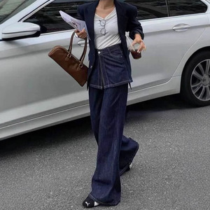 高腰显瘦阔腿喇叭裤春秋2025新款设计假两件深蓝色微喇牛仔裤女装