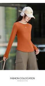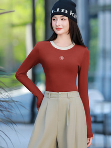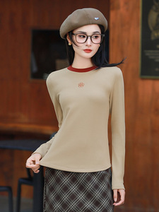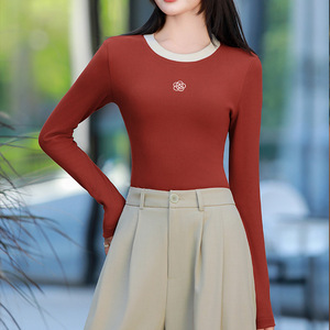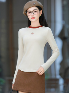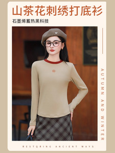 秋冬の人気商品、コントラストカラーの襟に椿の刺繍が施されたグラフェン素材の肩当て付き暖かいレディース長袖インナー1332