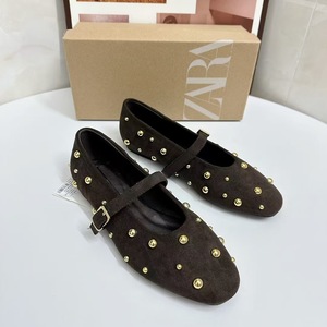 ZA スペイン 2025 夏の新製品ワンラインラウンドトゥリベットブラックブラウンスエードレザーバレエフラットシューズ女性用